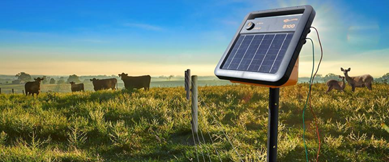 Energizador de valla solar S100:  Alimenta hasta 30 millas / 100 acres y viene con un panel solar integrado, batería recargable y juego de cables.